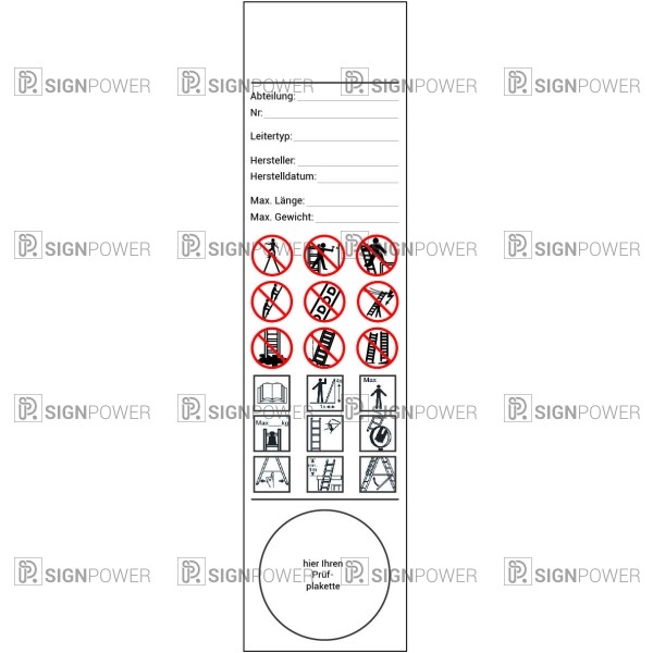 Das verwendete Material ist ein wasserdichtes Glanzvinyl. Ein Prüfplakette kann am unteren Rand des Aufklebers angebracht werden, um anzuzeigen, wann die nächste Inspektion stattfinden muss.