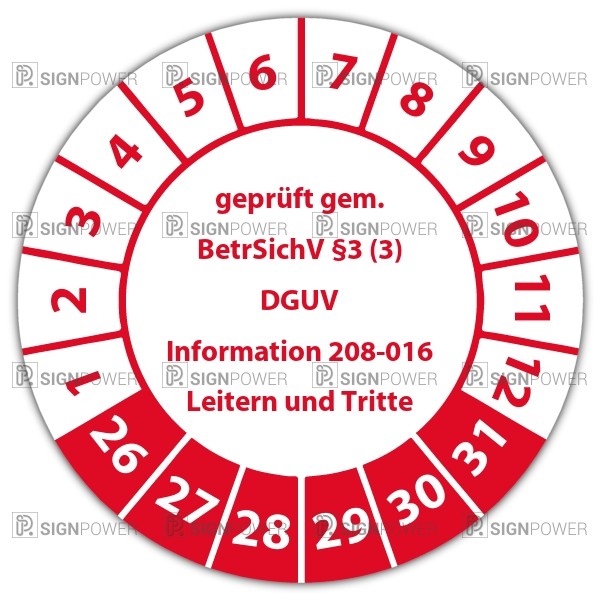 • Prüfplakette "geprüft gem. BetrSichV §3 (3) DGUV Information 208-016 Leitern und Tritte" Prüfplakette "geprüft gem. BetrSichV §3 (3) DGUV Information 208-016 Leitern und Tritte" logo
