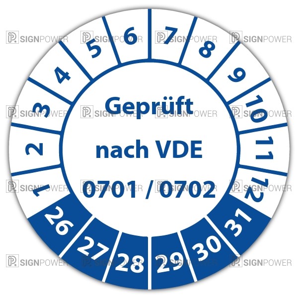 Prüfplakette für die Elektrotechnik mit der VDE-Zertifizierung als Standard. Wird auf handlichen Rollen geliefert und ist in verschiedenen Formen und Größen erhältlich. auch mit kostenlosem Logo-Aufdruck möglich